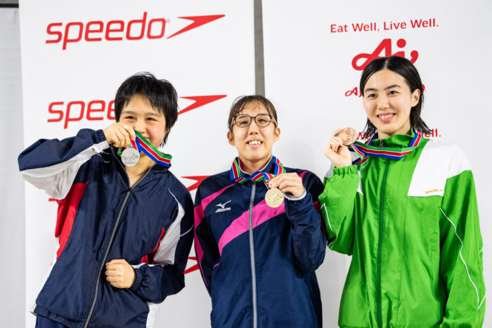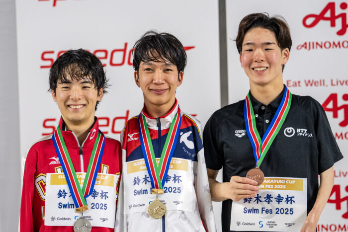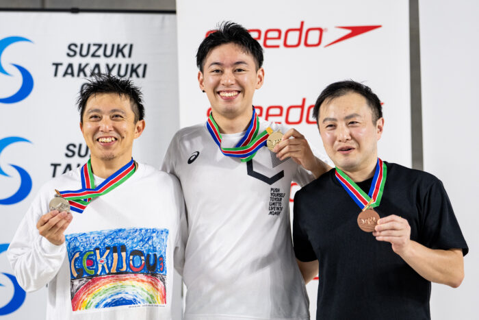 1位・荻原虎太郎(SM8・あいおいニッセイ/パラリンピアン)404 pts、2位・久保大樹(SM10・KBSクボタ/健常・障害両方の立場でトップスイマー)403 pts、3位・池山允浩(本大会出場2回目の社会人スイマー・EY Japan)383 pts 写真・秋冨哲生