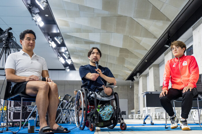 大会2日目には、オリ・パラ・デフという3つのカテゴリーが交差する象徴的なトークショーが行われた。登壇したのは、先月東京で開催されたデフリンピック女子50m平泳ぎ銀メダリストの久保南(大日本ダイヤコンサルタント)、主催者の鈴木孝幸、そして元オリンピアンの松田丈志氏だ。