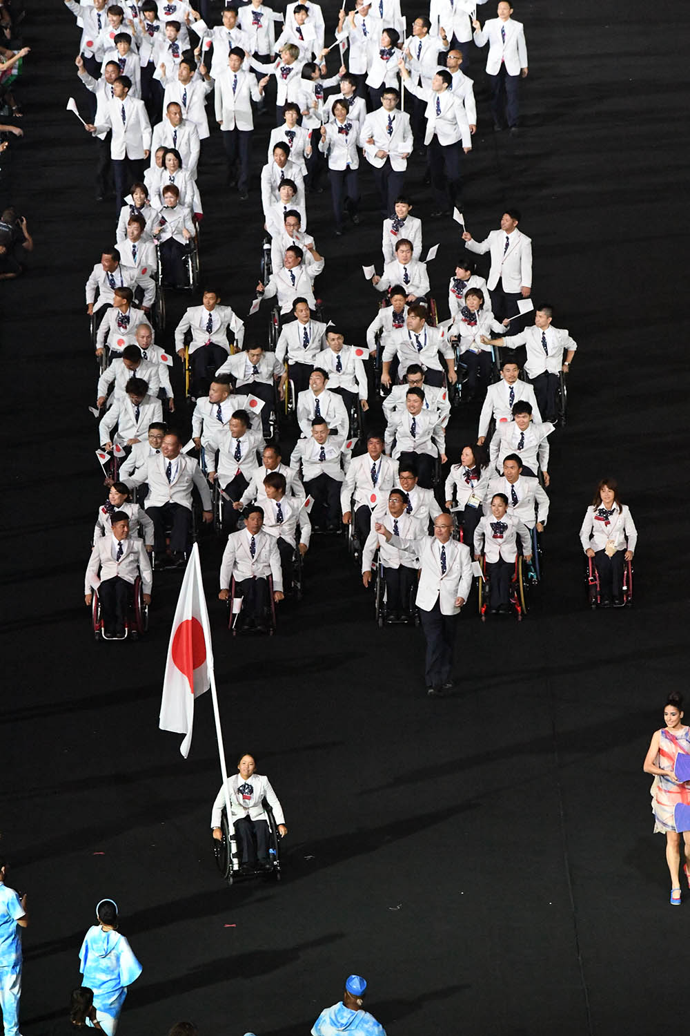 第4幕には、各国の代表行進が行われた。先頭は、今回のリオオリンピック・パラリンピックで初めて結成されることになった難民選手団が務めた。騎手は、シリア出身で、現在ギリシャに暮らす競泳のイブラハム・フセイン。フセインは内戦中のシリアで爆撃を受け右足を失った。シリア代表を目指し水泳の練習を続けていたフセインはギリシャでも練習を継続し、今回、難民選手団の代表に選ばれた。日本代表は83番目の登場となった。騎手の上地結衣に続き、60名の日本選手団が行進した。上地は潜在性二分脊椎の車いすテニスプレイヤー。これまで、女子車いすテニスで史上3組目となる4大大会制覇を達成し、今回のパラリンピックでもメダル獲得が期待される選手だ。騎手を務めたことについて上地は、「パラリンピックというアスリートの憧れの舞台で、騎手として日本代表選手団を先導できたこと、非常に光栄です。ひとまず大役を終え、ここからは競技者として結果を残せるよう、集中していきたいと思います」とコメントした。