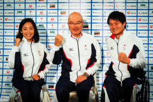 式典のあとに行なわれた記者会見で。左から、旗手・高桑早生(陸上)、大槻洋也団長、主将・国枝慎吾(車いすテニス) 写真・星野恭子