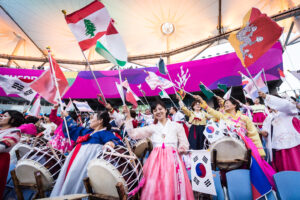 民族衣装(チマチョゴリ)で早くから会場に集まり、さまざまな国旗を手に多くの選手へエールを贈る韓国の人々