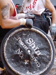 タックルでぼこぼこになったホイール=2004年2月29日(日)、横浜ラポール(撮影:角田麻子)