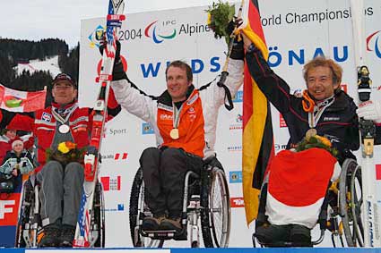 (写真 表彰台の長谷川選手。中央は、ソルトレイク・パラリンピック四冠王のマルティン・ブラクセンターラー選手<ドイツ>)