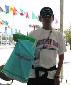 「丹沢選手の競技用のシューズの金具が壊れたので届けてほしい」−日本自転車協会スタッフから連絡があったのは14日。 関係者の出発と競技日程が合わないためのSOSということで、お引き受けしたのですが、無事、届けられるか心配しました。 17日は、メディア申請や開会式の入場券を手に入れねばならず、見知らぬ国で右往左往しましたが、選手村の入り口ゲートで、コーチの荒賀博志さん=写真にお渡ししました。丹沢秀樹選手は、大城竜之選手のパイロットを務めています。会場で応援する際、テレビに映った際は、足元にもちょっぴり注目してください。 でも、二人はトラックでの1キロタイム・トライアルという1キロの最速タイム競う競技で金メダルを狙っているほどですから、目を回さないようにしてくださいね。