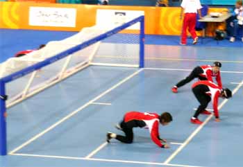 アテネパラリンピック大会−24日 ゴールボール女子日本代表チームはドイツと対戦し=写真、 6対3で勝利を収めた。予選リーグ残るはオランダとの対戦のみ。 ドイツとの対戦は、点の取り合いとなった。
