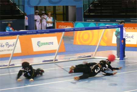 アテネパラリンピック大会−24日 ゴールボール女子日本代表がゴールを守り抜いた=写真。 日本、オランダどちらも決勝進出に負けられない試合だった。 前半5分5秒。中央右寄りに投げられた球は、センターの浅井を弾き、左右両選手がフォローに入るもゴールイン。1点を先制された。しかし、日本は冷静だった。チャンスを待ち、7分27秒にオランダが選手交代をした直後、交代した選手とセンターの間を狙い、ゴールを奪った。 後半は、オランダの2度のペナルティで、小宮がゴールを狙うも、必死のオランダも固い守りを見せ、1対1で終了した。