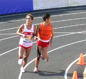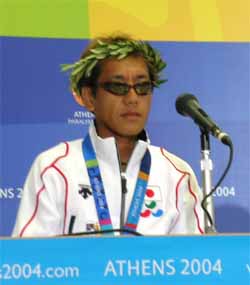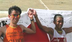 アテネパラリンピック大会−26日 マラソンの男子視覚障害B1クラスで、高橋勇市選手(39)が見事、金メダルを獲得した。タイムは2時間44秒24。また、同じB1クラスでマラソンに出場した福原良英選手(36)は2時間53分56秒の4位に、保科清選手(57)=写真右は、2時間56分30秒で5位に入た。 そのほか、B13のクラスで出場した福留史朗選手(46)も2時間51秒56のシーズン自己ベストを出して11位となり、視覚障害者マラソンで日本勢が健闘した。