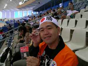 自転車競技の会場で、日本人応援団のグループを発見。ひときわ目立つオレンジの法被と日の丸の鉢巻姿は、長野県から来た中牧昭芳さん。 オリンピックから滞在しているという。「ピンバッジを集めているんです。パラリンピックは選手も友好的だし、年齢の高い選手もがんばっているので、応援もします」と話した。 きっかけは、長野パラリンピックにボランティアとして参加したことだという。スケート競技でボランティアをしたが、視覚障害の選手には、音を頼りに戦う競技の性格上、声を出して応援できなかったことに何か心に残るものがあったのか、次の大会も体験したくなったという。 今回中牧さんが渡しているバッヂは、2005年に長野で行われるスペシャル・オリンピック・ワールド・ウィンター・ゲームのもの。大会と長野のアピールも兼ねている。ピンバッジは、国際大会で、様々な国からの人と、気軽に交流できるきっかけの一つ。会場を歩いているとボランティアや子供たちから「バッヂ持ってる?」と声をかけられる。 中牧さんは、「どの競技を応援に行こうか、観たい競技が多いのだけど、体が一つしかないので、とても迷います」と楽しそうに話した。
