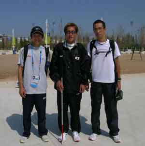 アテネパラリンピックのメイン会場OAKA(オアカ)で20日、高橋勇市選手=写真中央 と伴走者の中田崇志さん=同左、支援者の永目真吉さん=同右 と会った。