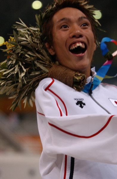 ![]() 水を得た魚のような、というたとえが好きだ。中村智太郎(平泳ぎ・SB7)はその魚のようだ。京都のプールで初めて見たとき人魚のように泳ぐ彼の泳ぎから目を離せなかったことを思い出す。平泳ぎとは、手で水をかき足で水を蹴る。中村智太郎は手を使わない。足、というか体すべてを使い静かに泳ぐ。とても静かに泳ぐ。横から見ると水をうまく利用し波に乗って進んでいくように見える。アテネで最初に見た中村智太郎は決勝のレースを前に余裕の表情でふらふら歩いている時だった。何コースなのかと尋ねてもはっきりしな答えしか返ってこなかった。中村にとってはどうでもいいことのようだ。5コースのスタート台に立った中村はいつものように天を仰ぐ。そして、さて、とばかりに水に帰っていくようなスタートをきる。ファインダー越しで見る中村はいつもいつも楽しそうに泳ぐ。アテネのプールでもそれは変わらなかった。あっという間の100Mを泳ぎ、頭でゴールのタッチをして掲示板を見た中村の顔が忘れられない。普段から大きい目を一段と大きく見開き、3位を確認した。水面から出ている顔だけで喜びを表現した。中国選手と同タイム銅メダル。意味もなく緊張していた私までにやけた。世界3位。表彰台に堂々と上がった中村の嬉しそうな顔は、人魚ではなく和歌山の橋本で練習しているという大学生の水泳選手の顔だった。緊張しすぎたため納得のいかない写真しか撮れなかったことは言い訳とし、飛び上がりたいくらい嬉しかったその感情をくれた中村に感謝して、これからも水に帰っていくようなスタートを見るため私は中村のファンであろうと思った。 記事に関するご意見・感想はこちらへ → info@paraphoto.org / BBS |