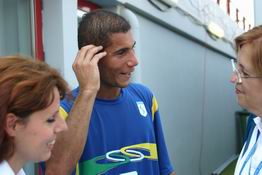 <ブラジル7番BRUZZI Fabiano選手> 貴重な追加点を決め、強豪ロシアを破る立役者になったブラジルのファンタジスタ、Fabiano選手は満面の笑みを浮かべインタビューに答えてくれた。第一声は、神様の後押しがあったから勝利を掴むことができたので、神に感謝するとブラジルらしいコメントだった。オリンピックで妨害されて金メダルを逃したブラジルのマラソン選手も、これは神が与えた試練なのだと言っていたのを思い出した。ブラジルの選手は神の存在を近いところに感じながら、試合に臨んでいるのだ。このゲームはゴールすることより、ロシアのストライカーの15番を抑えることが最重要事項だったそうだ。1点ロシアの15番に取られたものの、結果的に決勝点となる追加点をきめることができて感無量だと、充実した表情をしていた。恒例のあなたはプロ選手ですかと聞くと、デパートのエレベーターサービスをしているそうだ。皆、別の仕事を持ちながら、サッカーしているようである。