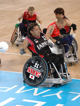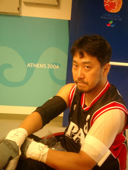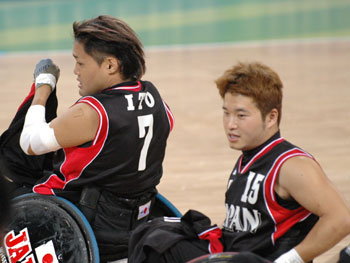 出られなくなった #7 伊藤、#15 川村のユニフォームを 下に着てプレーした #11 仲里(左)、#9 田村) キャプテンの #3 福井は、誠実な彼らしく、言葉を選びながら丁寧に話してくれたが、やはり言葉の端々ににじむ悔しさを、抑えることはできなかった。 - 残念な結果になってしまった 「悔しいです。本当に悔しい。でも、明日あさってと試合があるので、それに向かって、少しでも上位を狙っていけるように、気持ちを切り替えてやっていく」 - 今回、この持ち点再審査の混乱が起こったこと自体、チームには大きな不満があると思うが 「IWRF(国際ウィルチェアラグビー連盟)のルールに基づいた持ち点で、長い時間をかけてチーム作りを進めてきたのだが、今回突然、IPC (国際パラリンピック委員会)の基準で再審査を受けることになった。個人的には、平等性に欠ける部分があると思う。IWRF で(一定の条件を満たして)持ち点が確定している選手は今回再審査を受けない、という状況の中で、日本チームは全員が再検査を受けさせられた。審査者の意見にも納得できない部分が多い。しかし、審査した結果の点数に関しては仕方ないのかも知れないが、それならパラリンピックに参加する全員が審査を受けるべきではないのか。しかも、非常に海外経験の長いメンバー(主に#7 伊藤のこと)も再審査の進行状況の影響で今日出られなくなったのは腑に落ちない。できるだけ出られるように、日本選手団と協議しながら進めていきたい。」 - アテネに来てからこういうことになって、「時間がない」ことが一番苦しかったのでは 「(過去数年の代表合宿などで)今まで積み上げてきたものが、こういう形(直前の持ち点変更)でパラリンピックの本番で発揮するチャンスを奪われてしまったことが、とにかく悔しくてならない」 - 今日のイギリス戦では、特にディフェンス面で苦しかったと思うが 「組んだことの無いラインでのコミュニケーションが難しかった。また、ボールマンに対するカバーが遅れたというのはある。 それもこれも全て、これまでやってきた練習の成果を発揮する機会が与えられなかったからだ。我々はメダルゲームに絡んでいける練習をしてきたから、そこで作り上げたラインでさえゲームができたのなら、絶対にこんな結果、試合内容にはならないはずだ。 そんな中でも、今日の試合ではプレッシャーをかけられた状態でも得点できたし、機転の効いたいいプレーもいくつも出た。明日につながるだろう。」 - #11 仲里と #9 田村が、今日出られなかった #7 伊藤と #15 川村のジャージを着てゲームに出たい、と言ってきたことを聞いたときは 「本当にうれしかった。我々も、番号をいろんなところに書き込んで、一緒に戦う、という意志を持って臨んだが、結果は残念だった。しかし、彼ら二人(#7伊藤・#15川村)も、力を貸してくれてくれていたと思う。」 - 次に向けて 「5位から8位の間になってしまうが、5位を取るための戦いをする。持ち点のことでいろいろあったが、とにかく、我々にできることは、コートの上で全力を尽くして戦うことだけなのだから。明日は絶対勝つ。」 福井の言葉を聞いて、涙が出た。パラリンピックに出るチームを引っ張るキャプテンとして、本当にすばらしい人だな、と思った。 苦しい思いは、いつか報いられるはずだ。まず、ここアテネで、一つ勝つことだ。 力を出し尽くす。このことに尽きる。