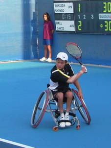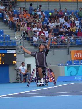 9月23日、オリンピックテニスセンターで男子シングルス準々決勝が行われた。 この日は、日本車いすテニス界の第一人者の斎田悟司(32)が世界ランキングbPのロビン・アマラン(オランダ)と、また若手で急成長中の国枝慎吾(20)は世界ランキングbQのデビッド・ホール(オーストラリア)と対戦した。アテネでの金メダルを目標として、日々トレーニングを積んできた二人にとって、いちばんの山場を迎えていた。 しかし、両選手とも善戦したものの、準々決勝で敗退となってしまった。 国枝は、2−6で第1セットを落としたあと、6−0で第2セットを奪い返した。ホール相手に1セットを奪いはしたが、力の差を見せつけられ、第3セット4−6で敗れた。 「第2セットから気持ちを切り替えました。ホールも調子が落ちたので、一気にいってやろうと思いました。でも力の差が出たかな、という感じでした」 と、国枝は試合を振り返った。