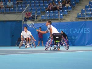 男子シングルスが行われた約1時間後、男子ダブルス準々決勝が行われた。アテネでの金メダルを目標にしてきた斎田悟司と国枝慎吾の一つは果たせなかった。しかし、その敗北が、二人のダブルス優勝へのモチベーションを下げることにはならなかった。 シングルス敗退直後にダブルスの試合に臨んだ斎田/国枝組だったが、短時間の間に気持ちは切り替えられていた。「気持ちの切り替えは完璧にできていました。お互いにダブルスに集中しようと話し合いました」(国枝)「ダブルスが残っているから、お互いにすべてをかけて頑張ろうと話しました」(斎田) そう話したとおり、余裕の試合展開で6−1、6−1と相手を圧倒した。しかし、まだ小さなミスが少なくない。準決勝は、ボナコルソ/ホール組(オーストラリア)と対戦する(24日)。大事な場面でのミスを減らしていかないと、勝つのは難しいと、両選手の気持ちはすでに次の試合に向けられていた。