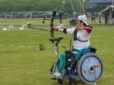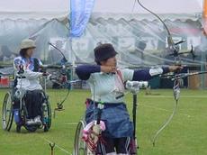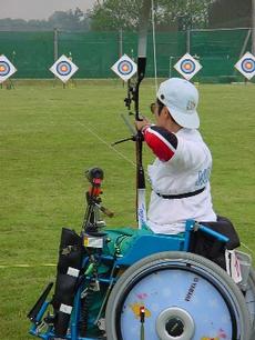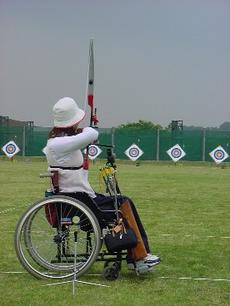 「70メートル」という距離を想像してみてほしい。 ジャンボジェット機の全長が70メートル。これじゃあんまりピンとこない…。身近なところでは、山手線の車両は1両が20メートルだから、70メートル先といえば、電車内を3両と半分も歩いた距離だ。 5月に埼玉県障害者交流センターで行われた「2004 ジャパンパラリンピックアーチェリー競技大会」で初めてアーチェリーという競技を見た私は、会場に着いてまずその的の遠さに驚いた。 目の前で行われていた「アーチェリー」というスポーツは、日常ではあまりピンとこない、そんな70メートルも遠くにある1.22メートルの的の、さらにたった12.2センチの10点満点の円をめがけて矢を射ち、的に当て、得点を競うのだ。 自分が放った矢が、山手線の車内を3両以上つっきったその先の、10センチそこそこの的に当たるなんて…!